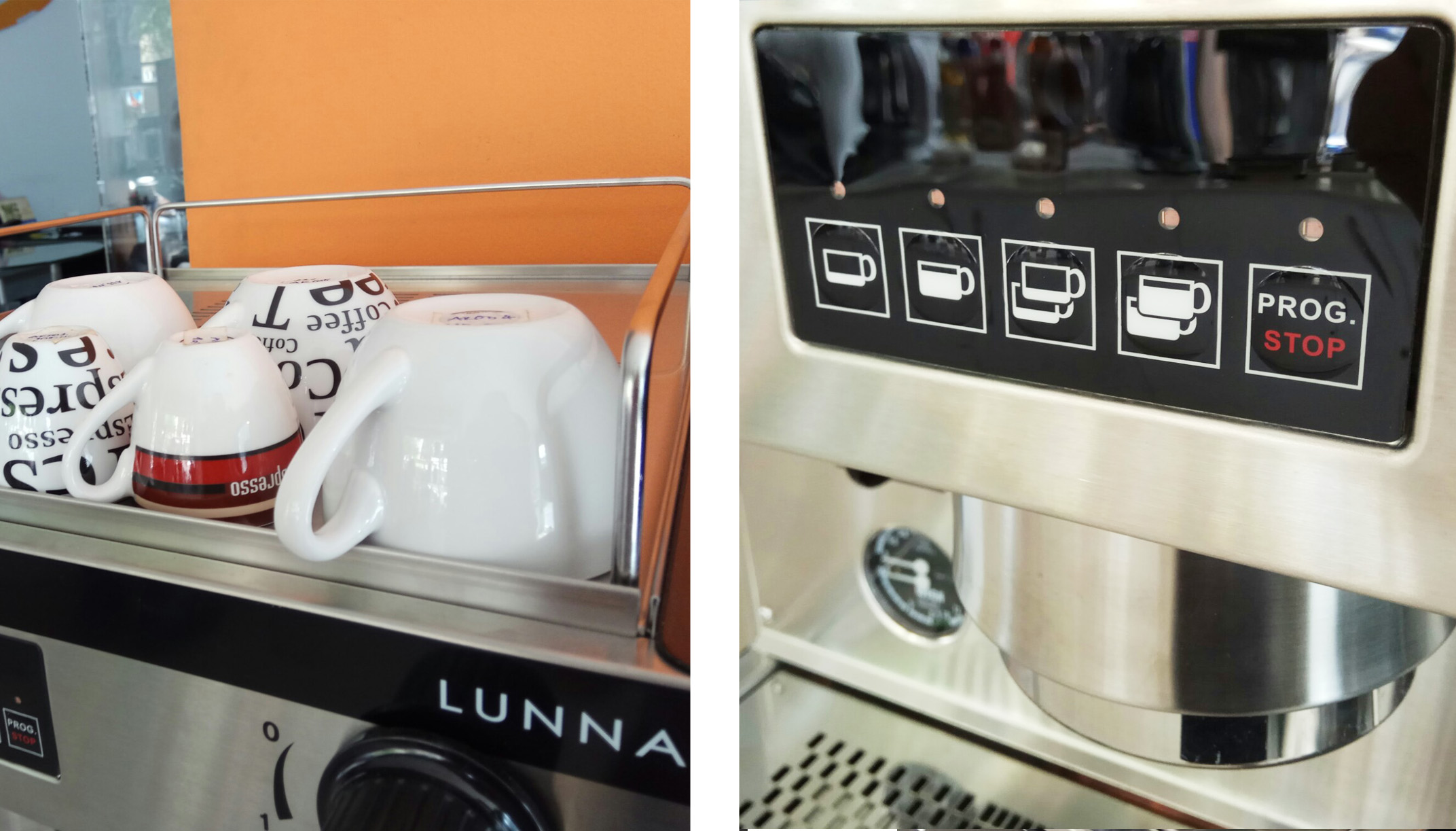 Ngoài ra, Wega Lunna còn có tích hợp bơm trong máy, thiết bị lọc làm mềm nước. Đèn báo hiệu mực nước trong bình đun. Đồng hồ hiển thị kép giúp barista dễ dàng quan sát, theo dõi nhiệt độ khi đánh sữa.