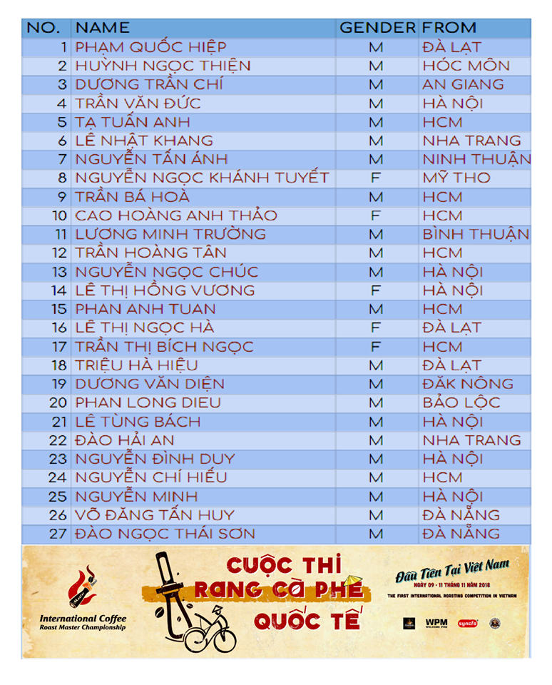 Cuối cùng thì BTC đã có được danh sách️ 27 thí sinh sáng giá của Cuộc Thi Rang Cà Phê Quốc Tế lần đầu tiên được tổ chức tại Việt Nam.